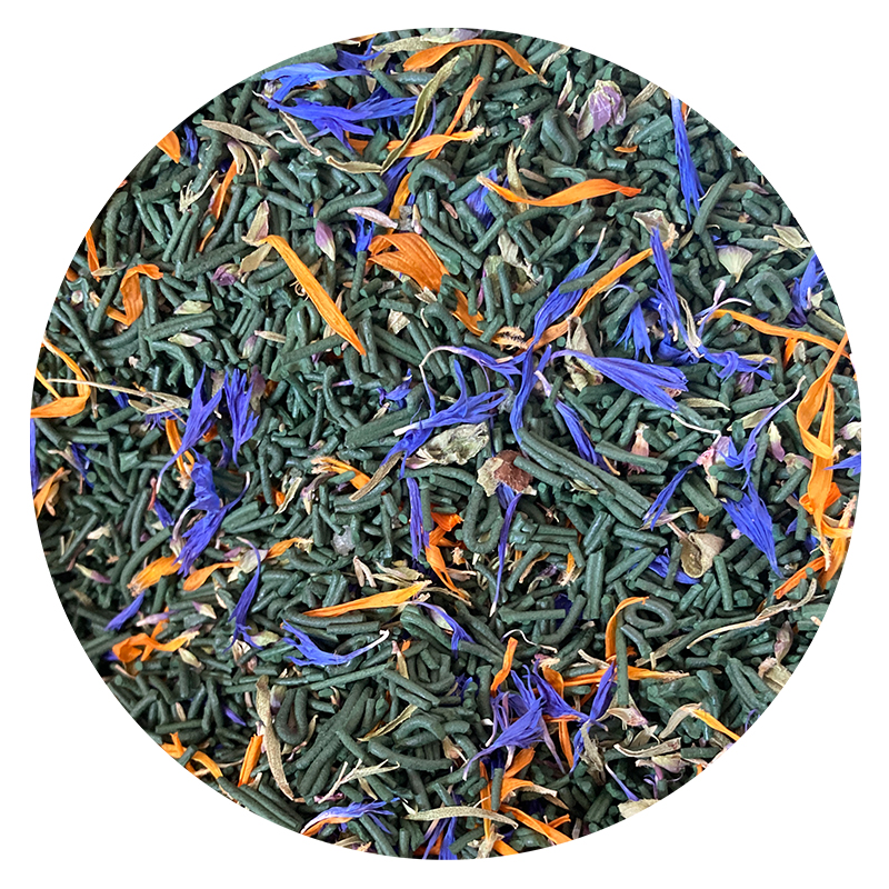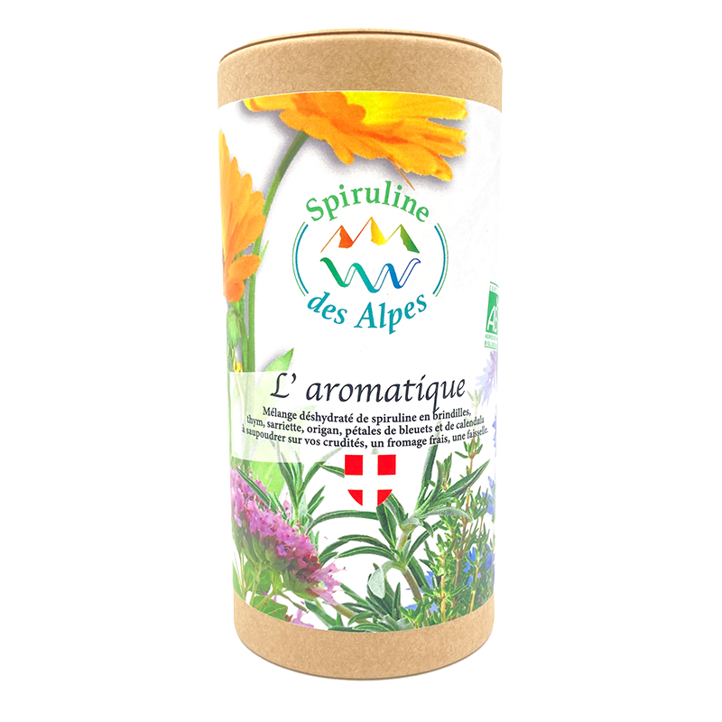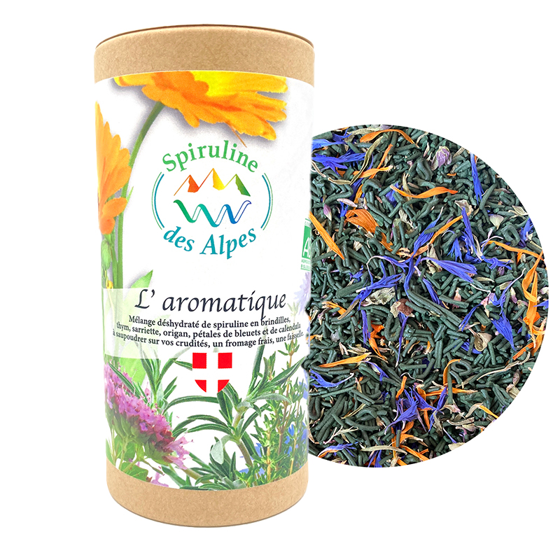 Cette petite préparation est composée de spiruline bio en brindilles, plantes aromatiques bio séchées ( thym, origan, sarriette), pétales séchées bio ( Calendula et Bleuet), fleur de sel.